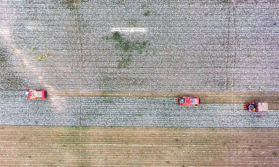 This aerial photo taken on Oct. 14, 2022 shows machinery cotton pickers working in a cotton field in Usu City, northwest China's Xinjiang Uygur Autonomous Region. (Photo by Zhang Jun/Xinhua)