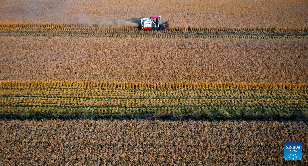 This aerial photo taken on Oct. 21, 2022 shows a reaper harvesting paddy rice in Huangfu Village, Chang'an District of Xi'an City, northwest China's Shaanxi Province. In recent years, Chang'an District develops ecological paddy fields and combines paddy rice industry with tourism, which improves the quality of local paddy rice and local economy. (Xinhua/Liu Xiao)