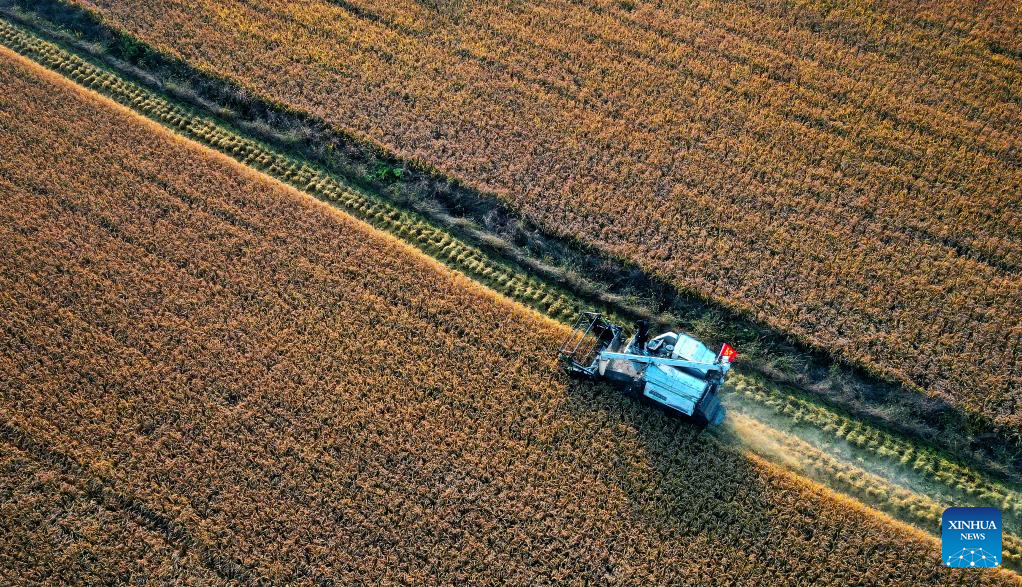 This photo taken on Oct. 21, 2022 shows a reaper harvesting paddy rice in Huangfu Village, Chang'an District of Xi'an City, northwest China's Shaanxi Province. In recent years, Chang'an District develops ecological paddy fields and combines paddy rice industry with tourism, which improves the quality of local paddy rice and local economy. (Xinhua/Liu Xiao)