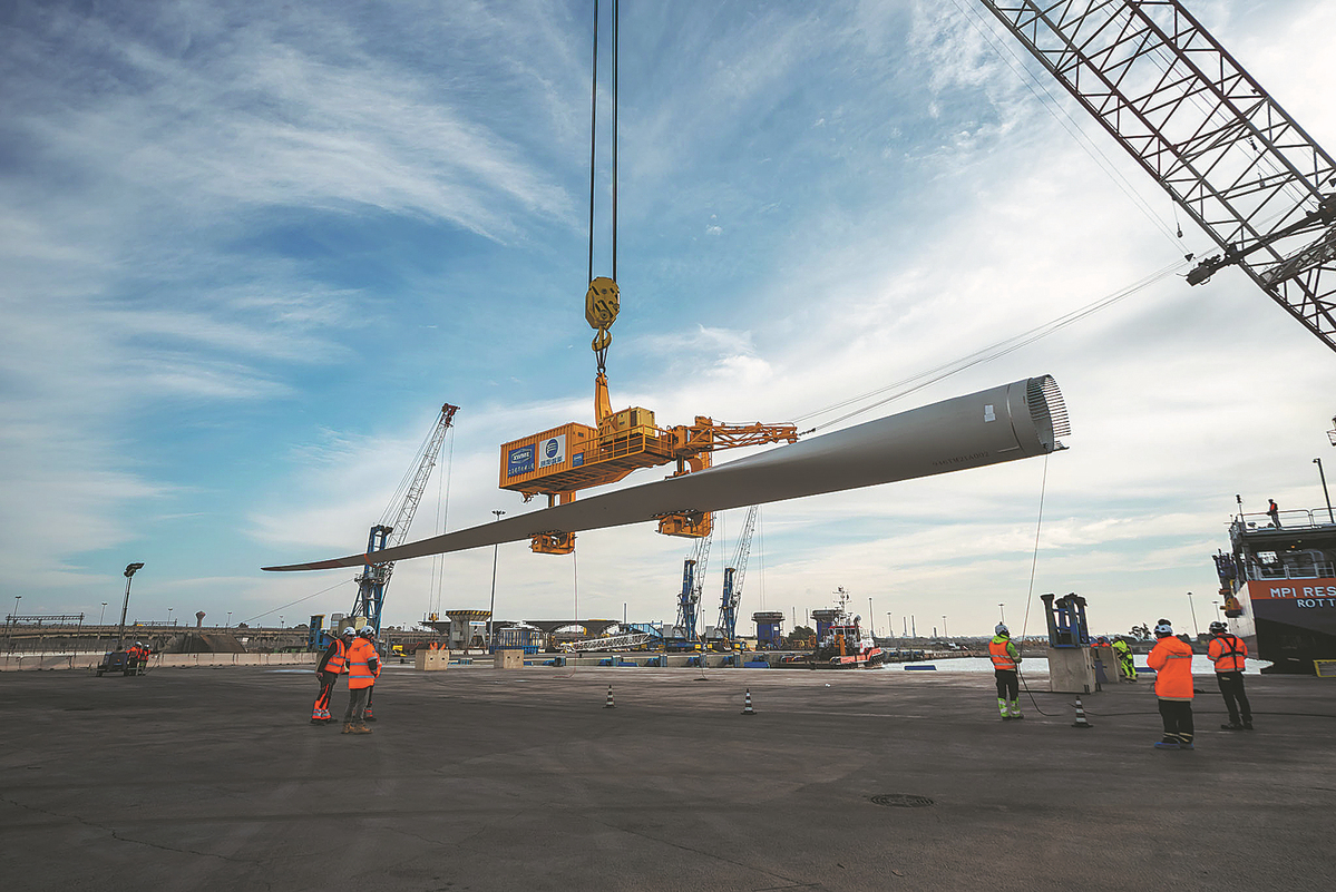 Workers hoist wind turbines in Taranto Port in Italy in January. [Photo/Xinhua]