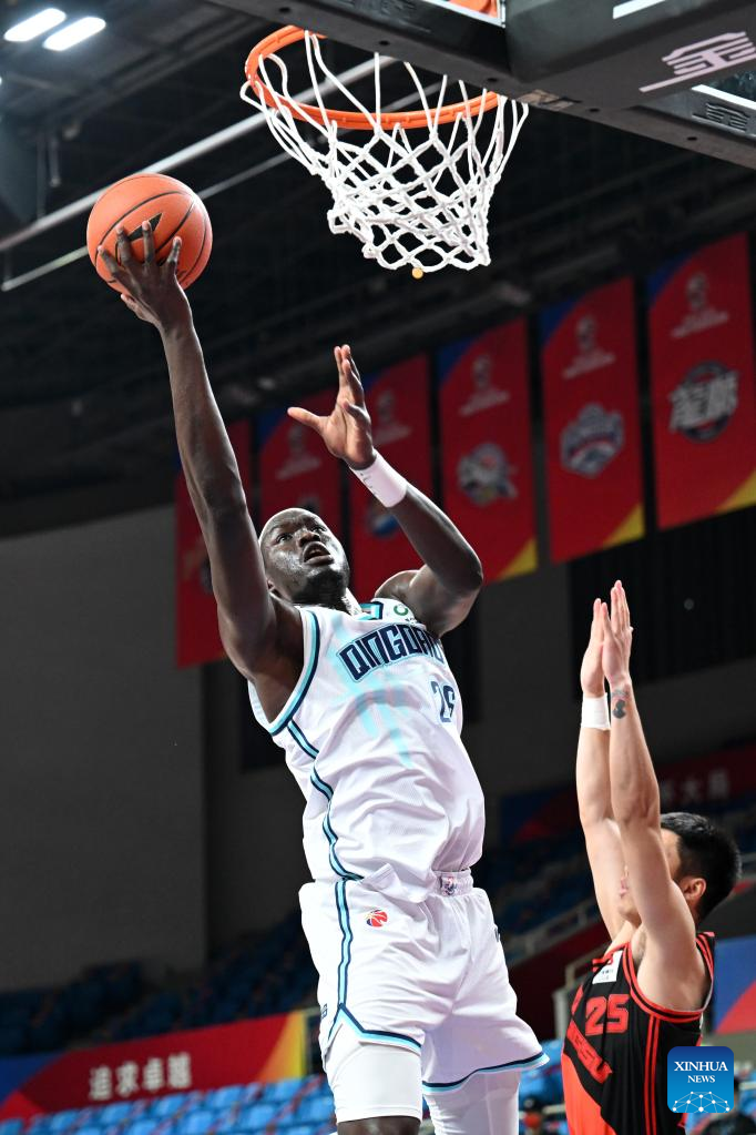 Qingdao Eagles' Duop Reath (L) goes for a lay-up during the 6th round match against Jiangsu Dragons at the 2022-2023 season of the Chinese Basketball Association (CBA) league in Hangzhou, east China's Zhejiang Province, Oct. 23, 2022. (Xinhua/Chen Zhenhai)