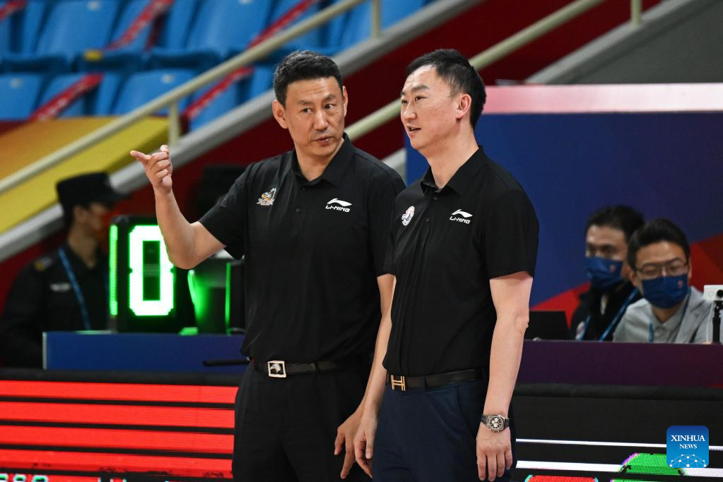 Head coach Li Nan (L) of Jiangsu Dragons talks with Liu Weiwei, head coach of Qingdao Eagles after their 6th round match at the 2022-2023 season of the Chinese Basketball Association (CBA) league in Hangzhou, east China's Zhejiang Province, Oct. 23, 2022. (Xinhua/Chen Zhenhai)