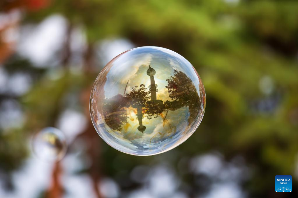 This photo taken on Oct. 23, 2022 shows a soap bubble reflecting the Namsan Seoul Tower at Namsan Park in Seoul, South Korea. (Xinhua/Wang Yiliang)