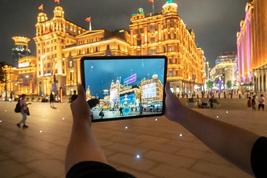 A Shanghai citizen experiences a Metaverse digital twin application on a tablet in the Bund, Shanghai, Aug. 30, 2022. (People's Daily Online/Wang Gang)