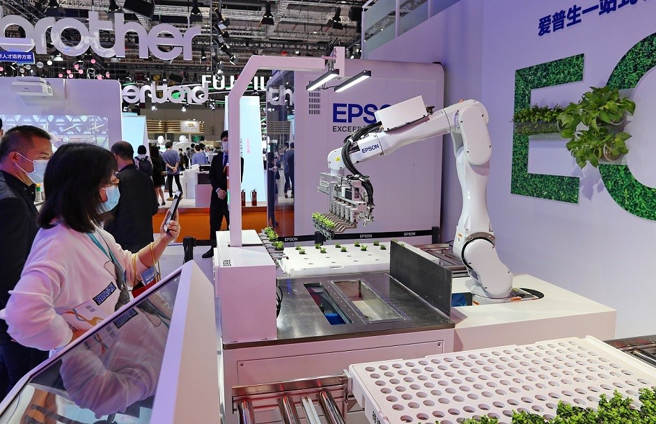 A 6-axis robot developed by Japanese electronics company Seiko Epson Corporation that can screen and grow seedlings attracts visitors at the fourth China International Import Expo in Shanghai, November 2021. (People's Daily Online/Xu Congjun)