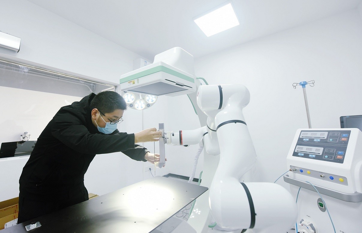 An AI industrial belt is launched in Xihu district, Hangzhou, east China's Zhejiang province, November 2021. Photo shows a technician debugging a medical robot. (People's Daily Online/Long Wei)