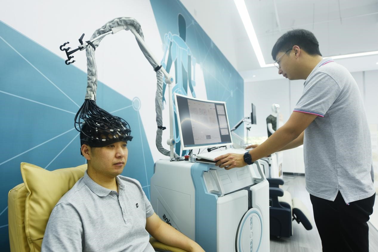 A citizen experiences functional near-infrared spectroscopy in an exhibition hall in Xihu district, Hangzhou, east China's Zhejiang province, July 31, 2022. (People's Daily Online/Long Wei)