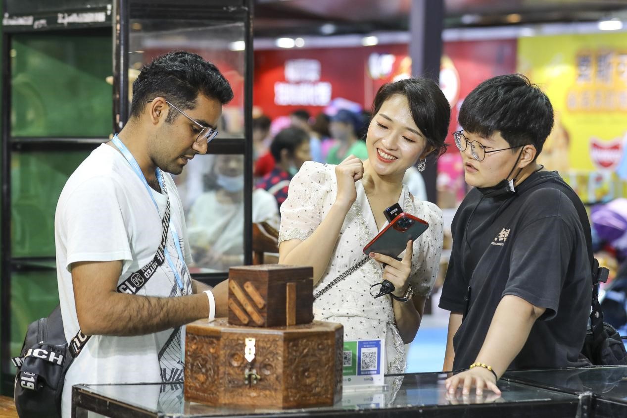 Visitors watch a jewelry box from Pakistan at the fourth 21st Century Maritime Silk Road Exposition held in Fuzhou, southeast China's Fujian province, May 20, 2021. (People's Daily Online/Xie Guiming)