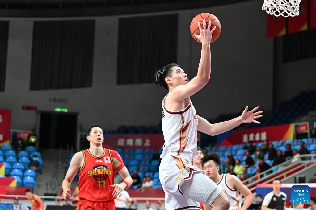 Cheng Shuaipeng (front) of Zhejiang Golden Bulls goes for a basket during the 7th round match between Zhejiang Golden Bulls and Shenzhen Leopards at the 2022-2023 season of the Chinese Basketball Association (CBA) league in Hangzhou, east China's Zhejiang Province, Oct. 24, 2022. (Xinhua/Chen Zhenhai)