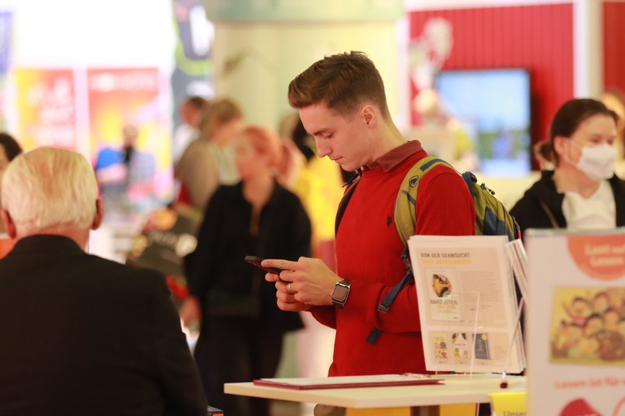 People visit the 74th Frankfurt Book Fair in Frankfurt, Germany on Oct. 19, 2022. (Xinhua/Du Zheyu)