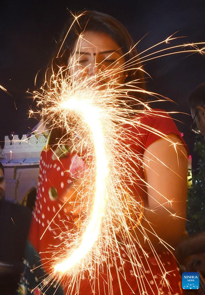 A woman burns a sparkler to celebrate Diwali, or the festival of lights, in southern Pakistani port city of Karachi, on Oct. 24, 2022. (Str/Xinhua)