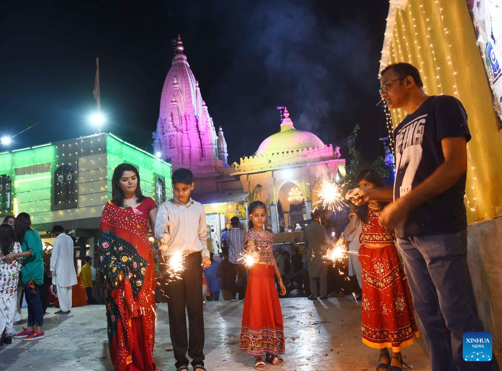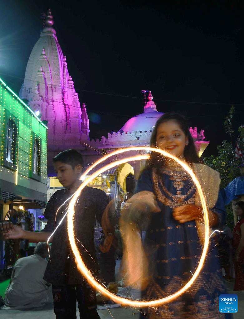 People burn sparklers to celebrate Diwali, or the festival of lights, in southern Pakistani port city of Karachi, on Oct. 24, 2022. (Str/Xinhua)