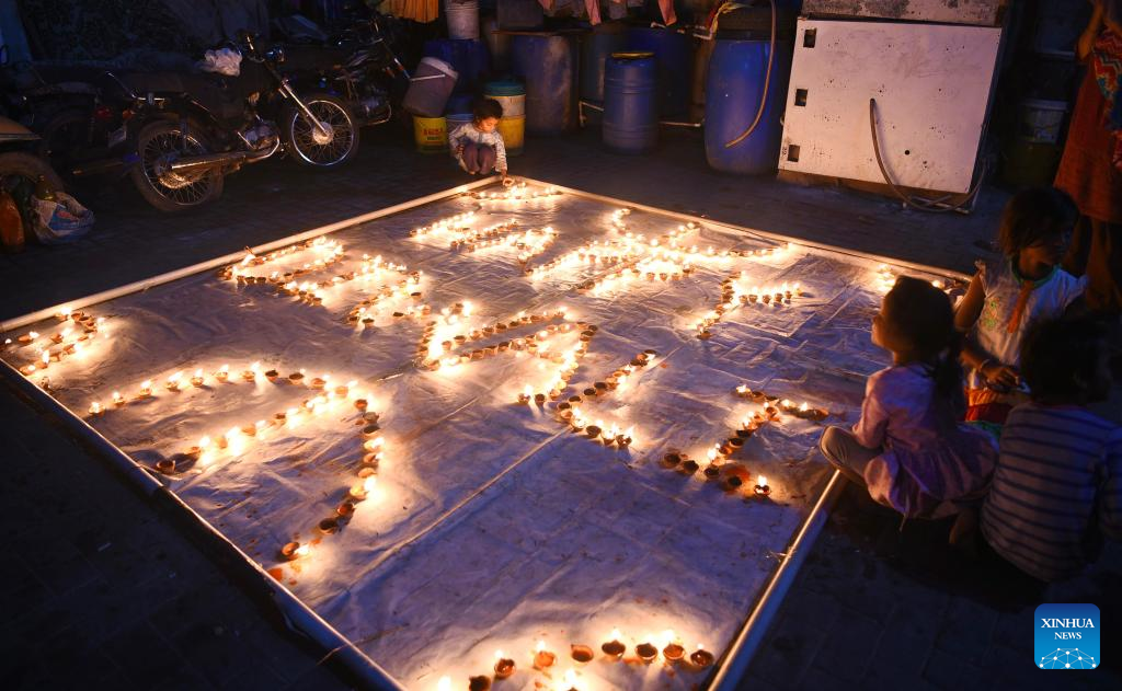Oil lamps are decorated to celebrate Diwali, or the festival of lights, in southern Pakistani port city of Karachi, on Oct. 24, 2022. (Str/Xinhua)