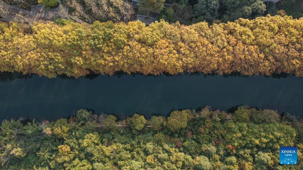 This aerial photo taken on Oct. 25, 2022 shows the autumn scenery of Huaxi national city wetland park in Guiyang, capital of southwest China's Guizhou Province. (Xinhua/Tao Liang)
