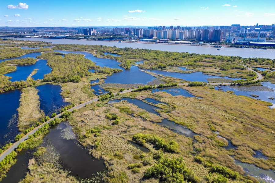 Aerial photo taken on Oct. 4, 2022 shows the scenery of a national wetland park in Harbin, northeast China's Heilongjiang Province. (Xinhua/Zhang Tao)