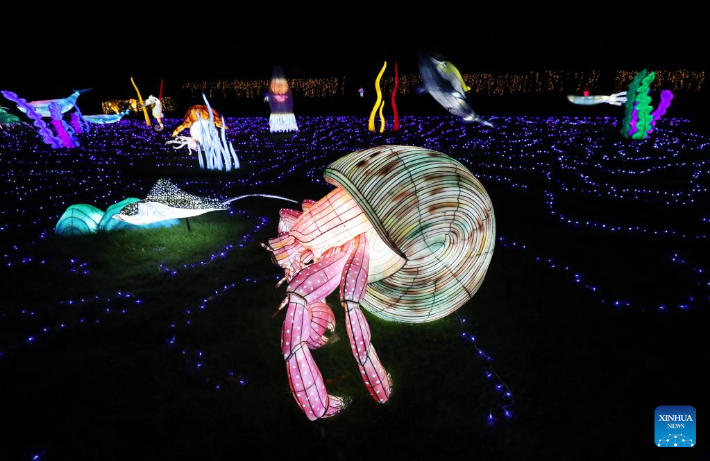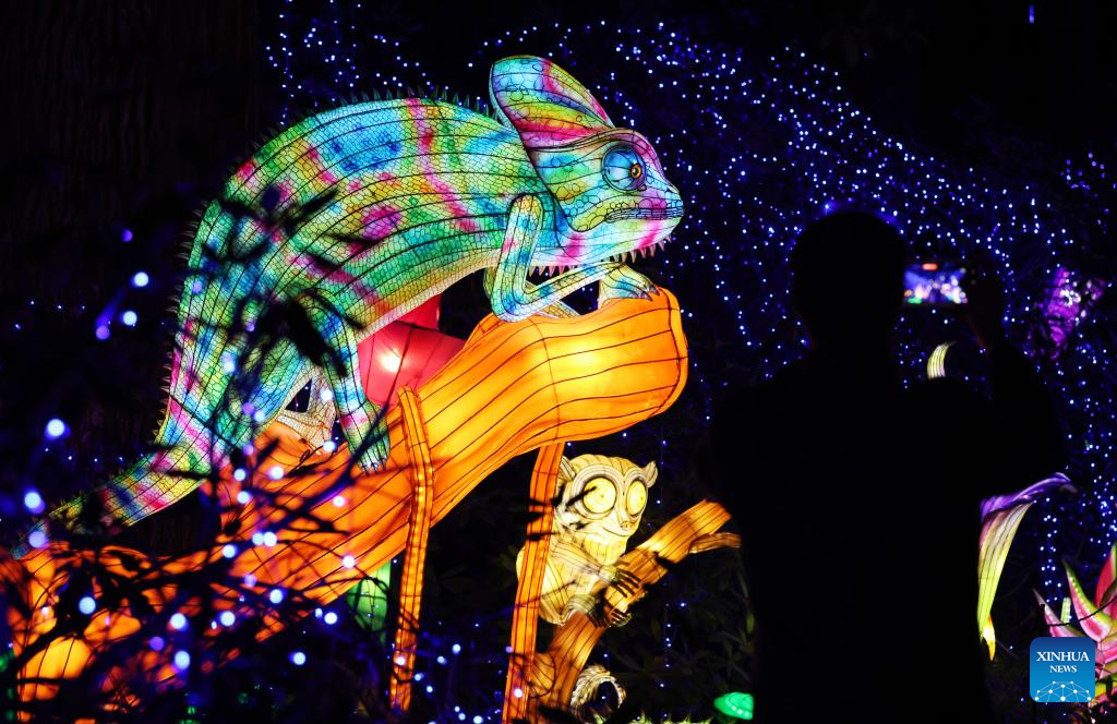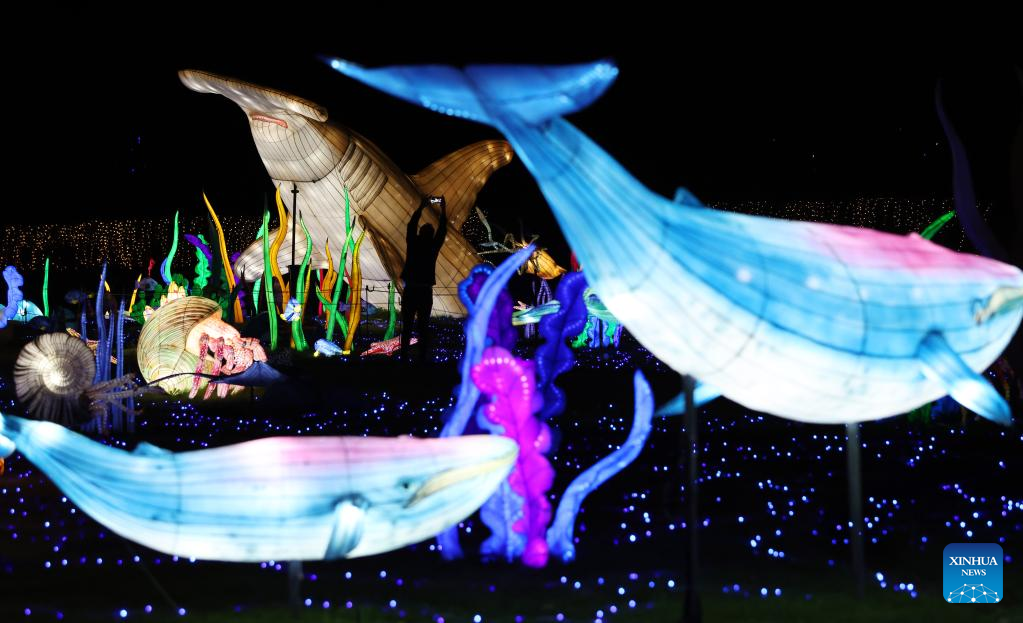 Illuminated sculptures are pictured during a media tour of a light festival at Thoiry zoo near Paris, France, Oct. 26, 2022. The festival will kick off here on Sunday, displaying around 2,000 illuminated sculptures. (Xinhua/Gao Jing)