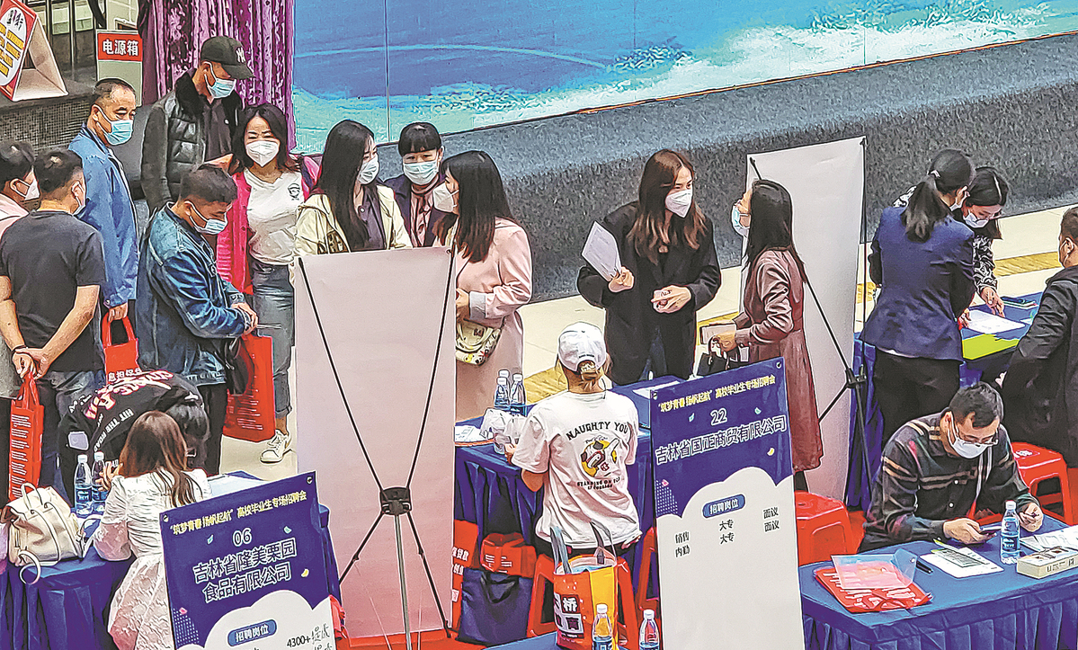 Job seekers ask for information at a career fair for college graduates in Changchun, Jilin province, on Sept 25. CHI XIAOWEI/FOR CHINA DAILY