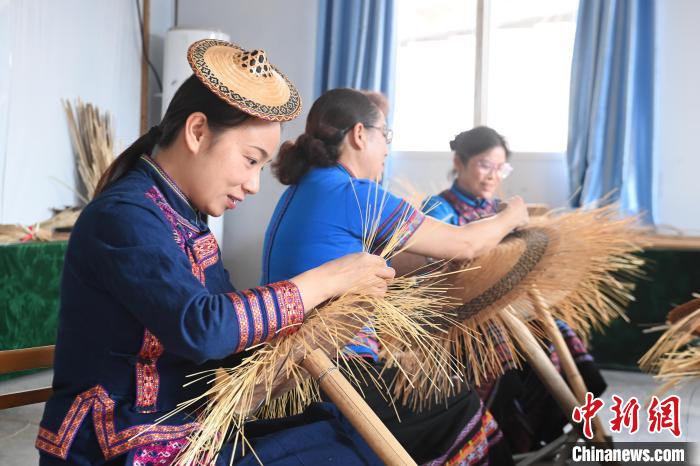 Tan's daughter Qin Min (L) weaves bamboo hats. (Photo/Wang Yizhao)