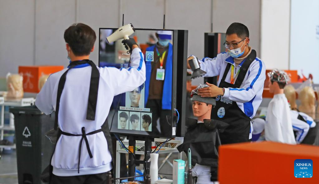 The competition kicked off in Shenyang on Thursday, with more than 1,600 contestants competing in flower arrangement, hairdressing, industrial internet engineering technology, unmanned aerial vehicle installation and maintenance, benchwork, furniture making, wall tiling and other contests. (Xinhua/Yang Qing)