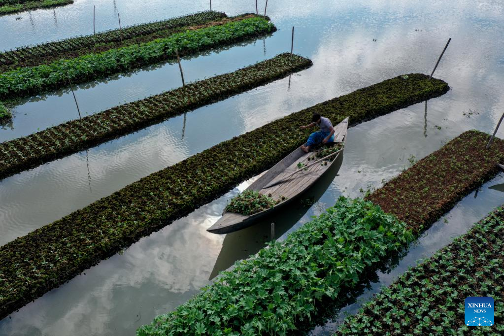 A farmer rows boat beside floating vegetable beds in Barisal, Bangladesh, Oct. 25, 2022. (Xinhua)