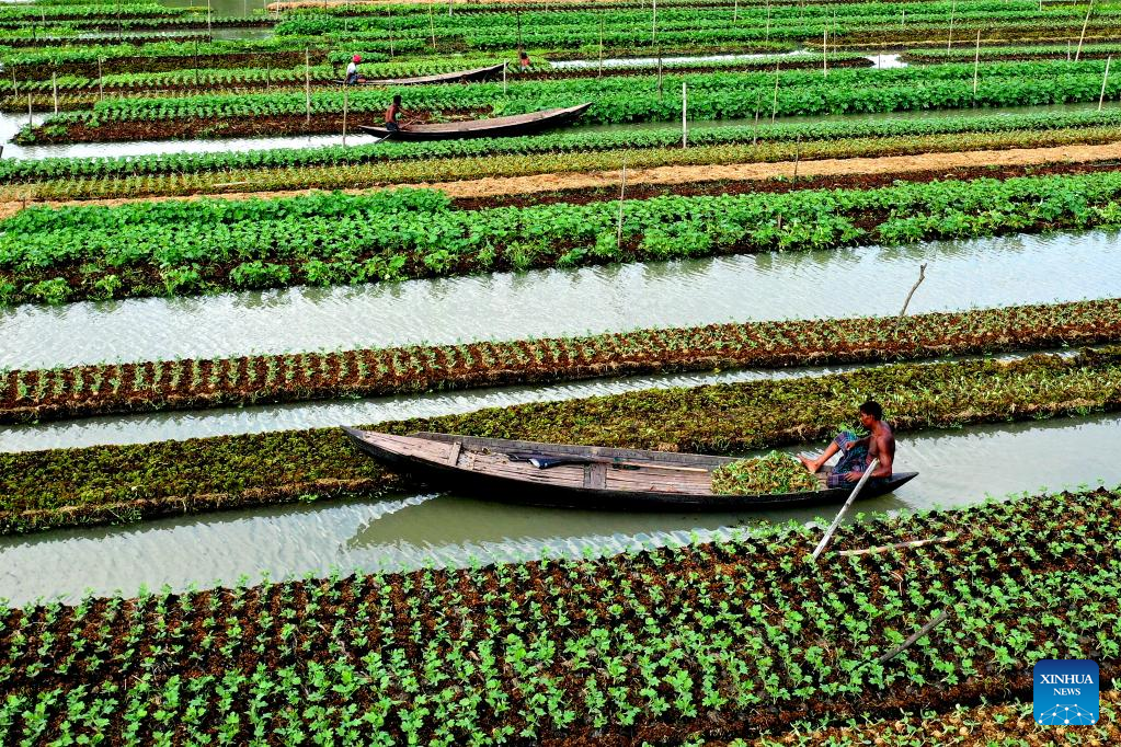 Farmers row boats beside floating vegetable beds in Barisal, Bangladesh, Oct. 25, 2022. (Xinhua)