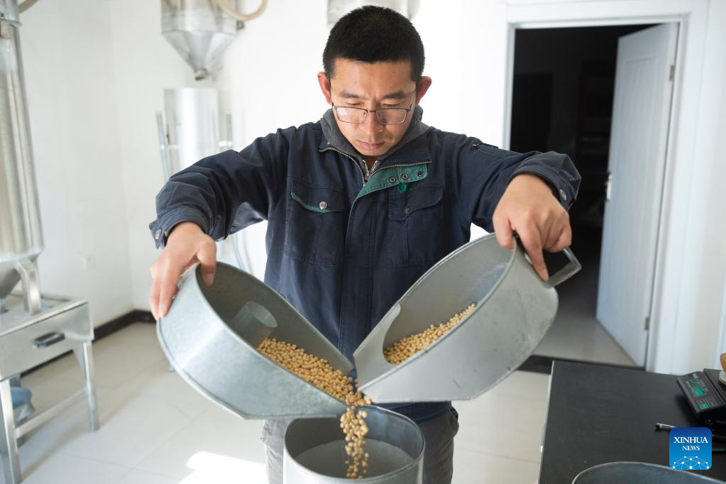 A worker mixes samples of soybeans at a company of China Grain Reserves Group (Sinograin) in Harbin, northeast China's Heilongjiang Province, Oct. 28, 2022. Autumn grain purchasing work is underway in Heilongjiang. (Xinhua/Xie Jianfei)