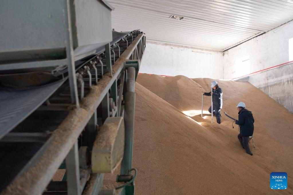 Workers take samples of soybeans at a grain trading company in Suihua, northeast China's Heilongjiang Province, Oct. 25, 2022. Autumn grain purchasing work is underway in Heilongjiang. (Xinhua/Zhang Tao)