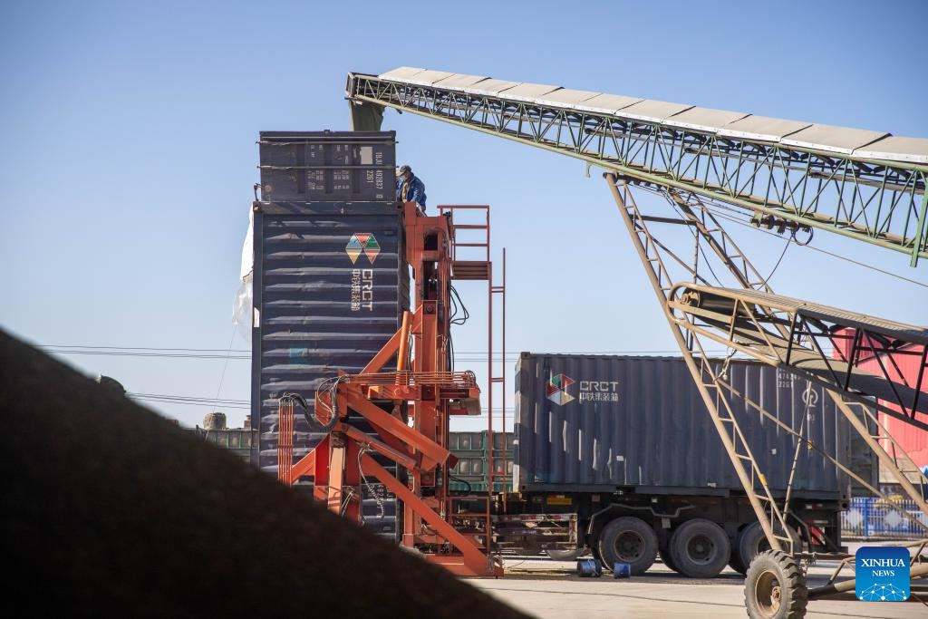 Soybeans are transferred to a railway freight container at a grain trading company in Suihua, northeast China's Heilongjiang Province, Oct. 25, 2022. Autumn grain purchasing work is underway in Heilongjiang. (Xinhua/Zhang Tao)