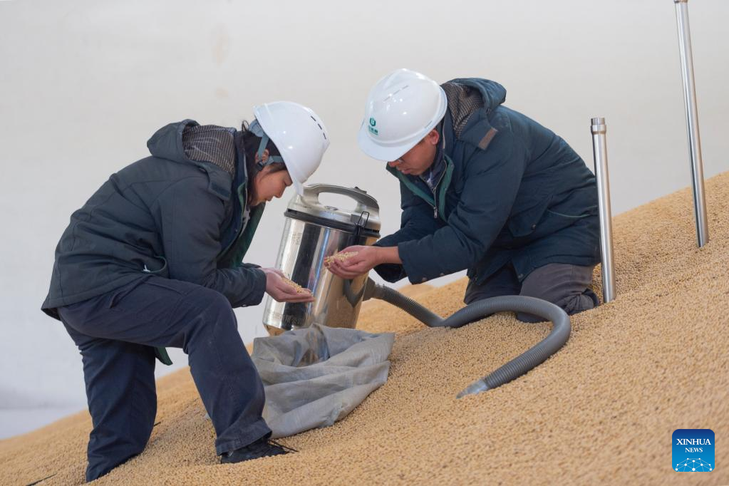 Workers take samples of newly purchased soybeans at a company of China Grain Reserves Group (Sinograin) in Harbin, northeast China's Heilongjiang Province, Oct. 28, 2022. Autumn grain purchasing work is underway in Heilongjiang. (Xinhua/Xie Jianfei)