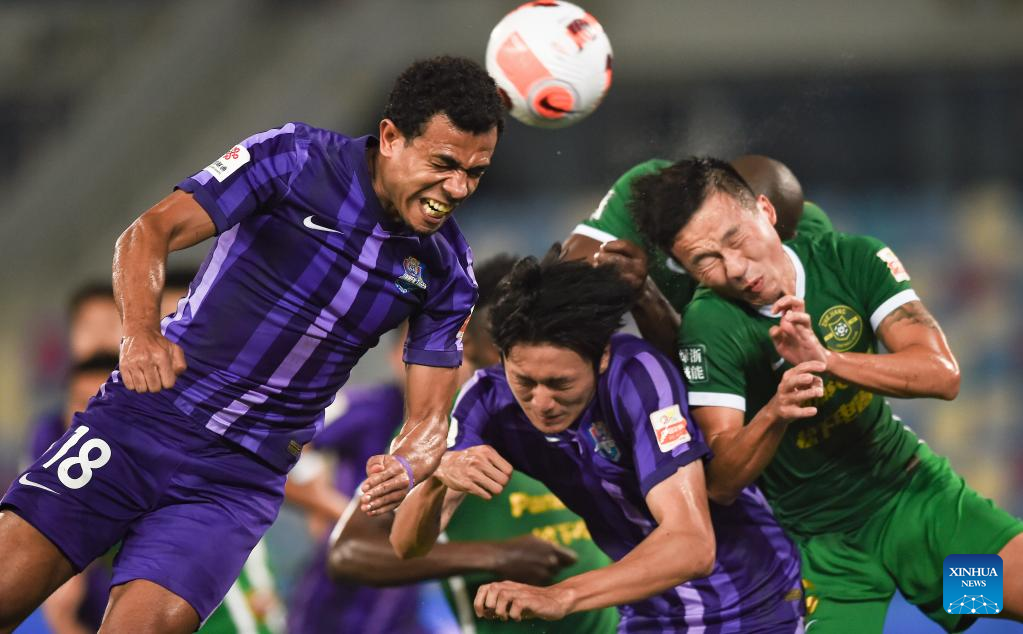 Farley Vieira Rosa (L) of Tianjin Jinmen Tigers vies for a header during a 2022 season Chinese Football Association Super League (CSL) match against Zhejiang FC in Haikou, south China's Hainan Province, Oct. 29, 2022. (Xinhua/Yang Guanyu)