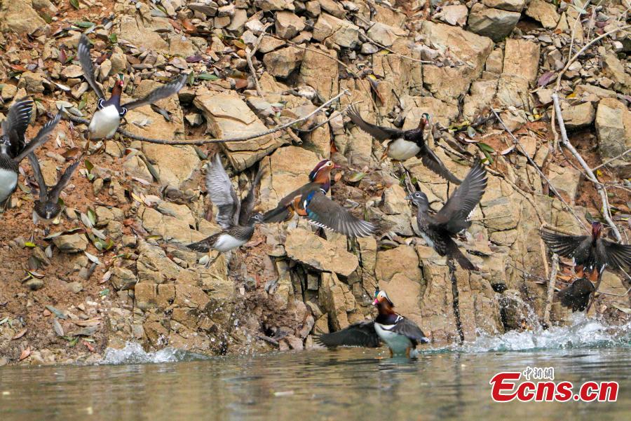 A flock of Mandarin ducks fly over the Diluo lake in Jiangkou County of Tongren City, southwest China's Guizhou Province. Migrant Mandarin ducks enjoy winter in Guizhou. (Photo: China News Service/Li He)