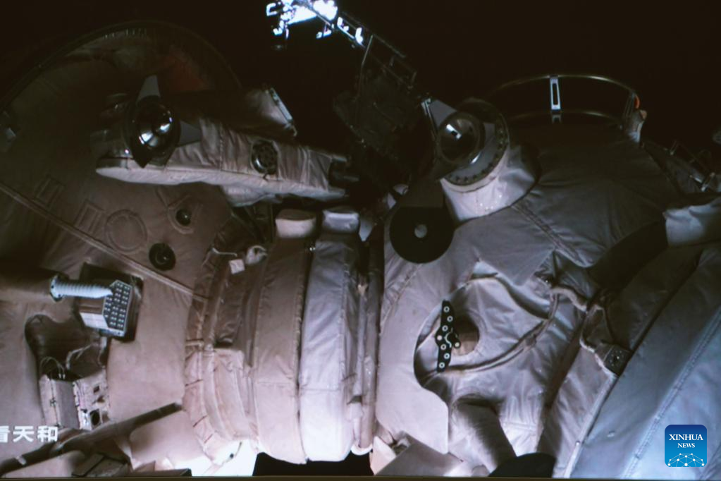 This screen image captured at Beijing Aerospace Control Center on Nov. 1, 2022 shows a view inside Tianhe core module after Mengtian lab module has successfully docked with the front port of Tianhe core module. The Mengtian lab module has successfully docked with China's Tiangong space station combination, according to the China Manned Space Agency (CMSA). (Photo by Sun Fengxiao/Xinhua)