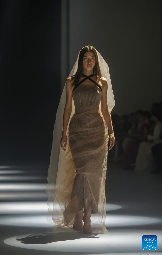 A model presents a creation by designer Stella Rissa during the last day of the Jakarta Fashion Week 2023 in Jakarta, Indonesia, Oct. 30, 2022. (Xinhua/Zulkarnain)