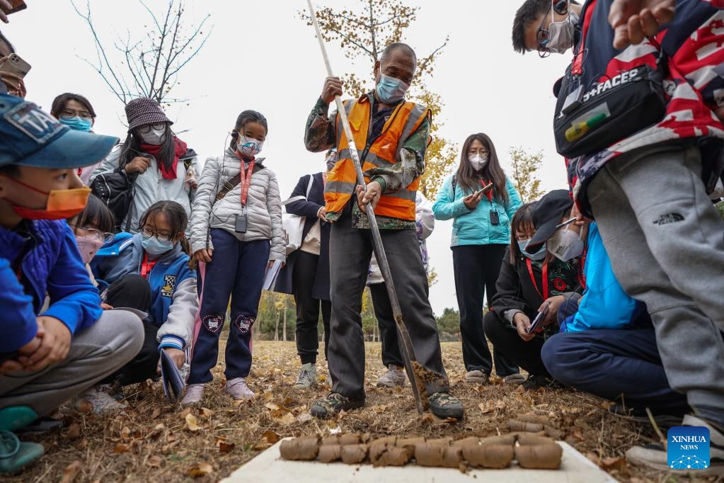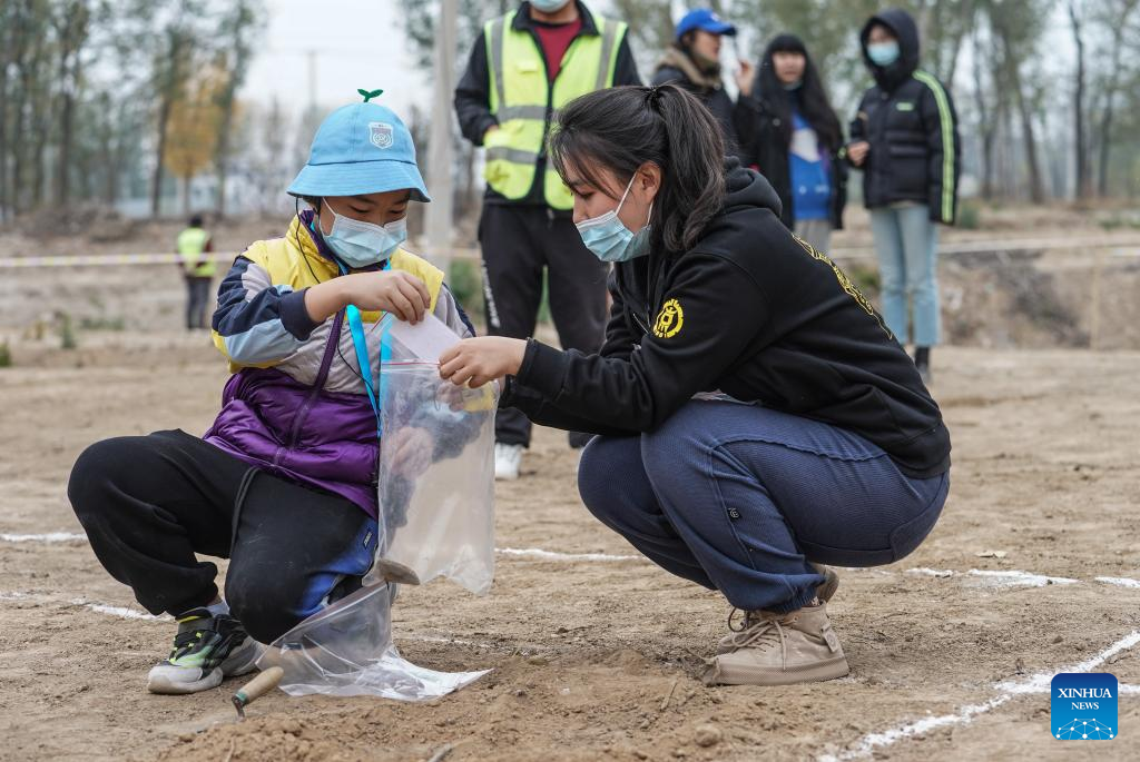 Children practice archaeological excavation work near the Liulihe relic site in Beijing, capital of China, Oct. 30, 2022. Liulihe relic site in Fangshan District of Beijing is believed to be the capital of the Yan kingdom during the Western Zhou Dynasty (1046-771 BC). As part of this year's Beijing Public Archaeology Season, a tour consisting of 20 families is organized to visit the Yan Capital Site Museum of Western Zhou Dynasty and Liulihe relic site on Sunday. (Xinhua/Chen Zhonghao)