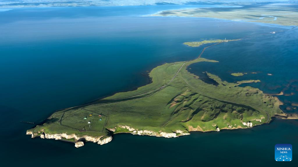 This aerial photo taken on July 10, 2020 shows a view of the Bird Island wetland at Qinghai Lake in northwest China's Qinghai Province.