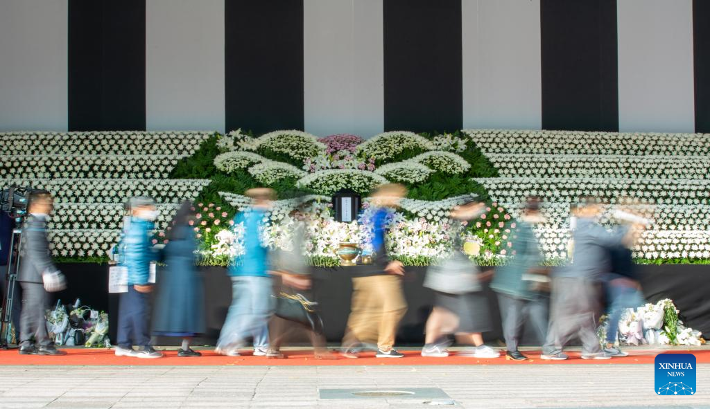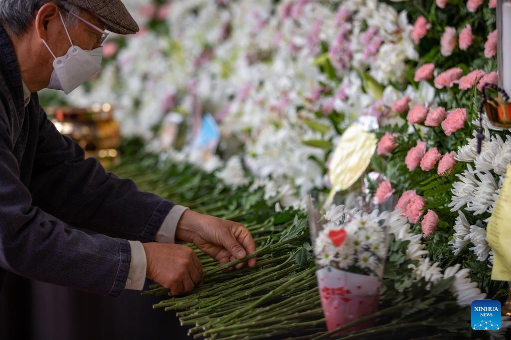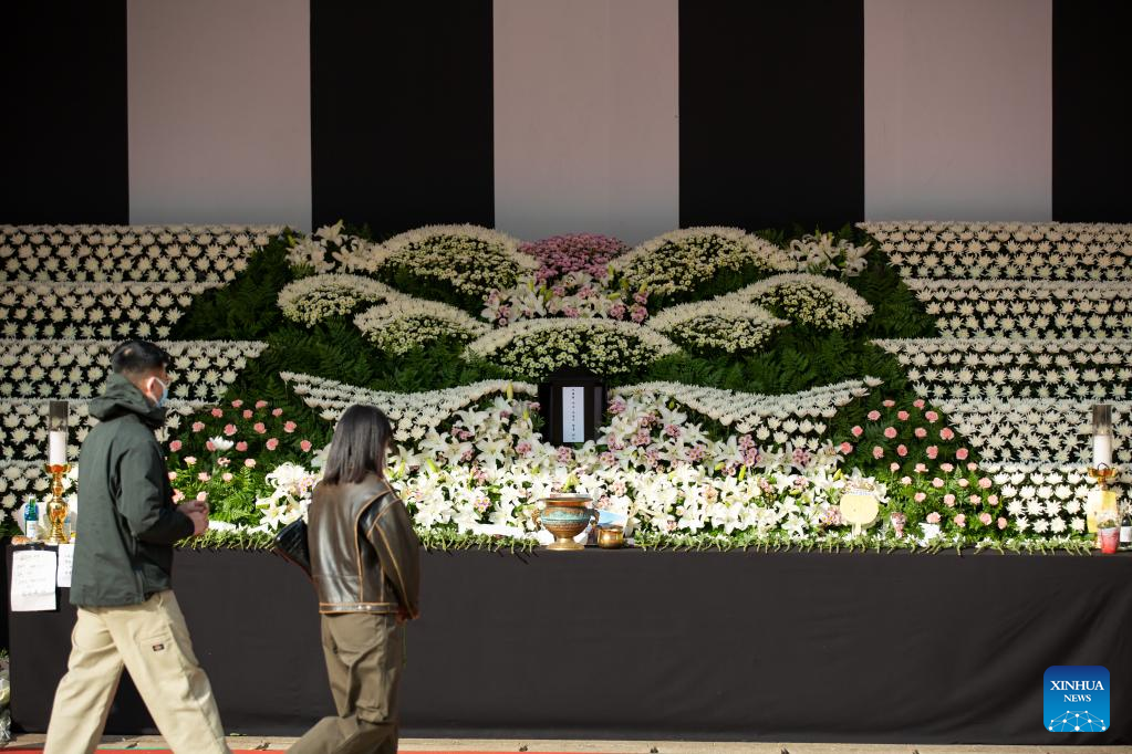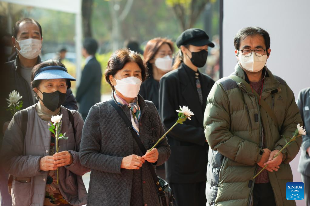 People lay flowers to a mourning altar set up at Seoul Plaza in Seoul, South Korea, Nov. 1, 2022. The death toll from a crowd crush, which occurred Saturday night at the Itaewon district of the South Korean capital Seoul during Halloween gatherings, rose overnight, the authorities said Tuesday. At least 156 people were killed and 151 others injured in the incident, according to the Ministry of the Interior and Safety. The government has announced a one-week national mourning period over the tragedy until Nov. 5. (Xinhua/Wang Yiliang)