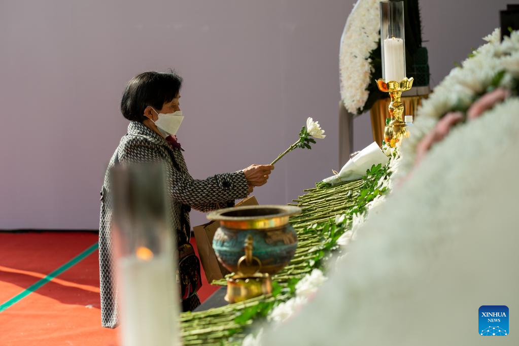 A woman lays a flower to a mourning altar set up at Seoul Plaza in Seoul, South Korea, Nov. 1, 2022. The death toll from a crowd crush, which occurred Saturday night at the Itaewon district of the South Korean capital Seoul during Halloween gatherings, rose overnight, the authorities said Tuesday. At least 156 people were killed and 151 others injured in the incident, according to the Ministry of the Interior and Safety. The government has announced a one-week national mourning period over the tragedy until Nov. 5. (Xinhua/Wang Yiliang)