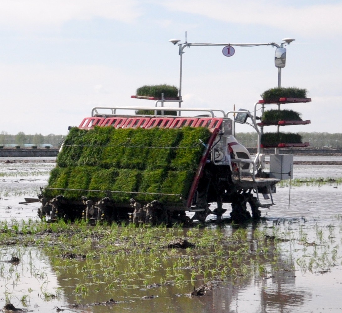 An unmanned rice planter operates on Qixing Farm on the Sanjiang Plain, a major rice growing area in Heilongjiang province, in May, 2020. [Photo by Wang Lijiao/For China Daily]