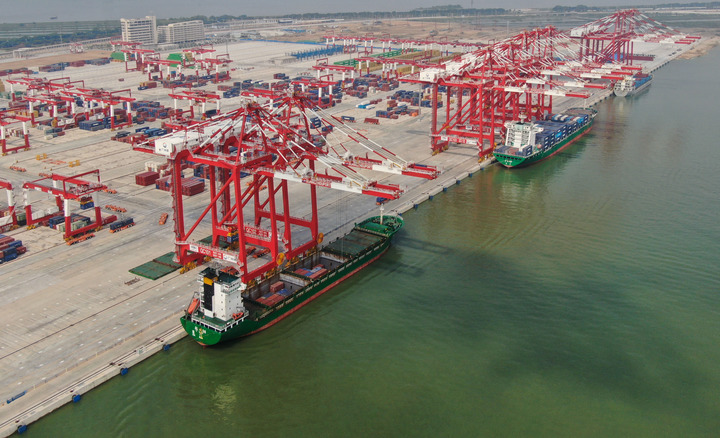 Aerial photo taken on July 28, 2022 shows the fourth phase of the full-automatic pier at the Nansha Port in Guangzhou, south China's Guangdong Province. (Xinhua/Deng Hua)