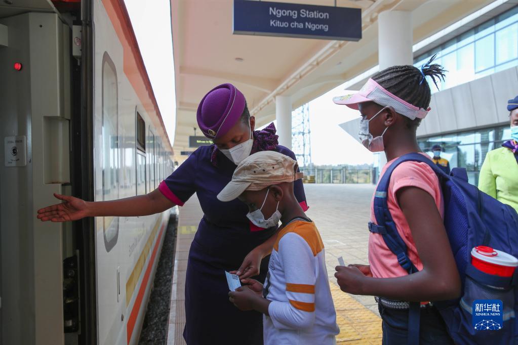 People board a train of the Chinese-built Mombasa-Nairobi Standard Gauge Railway (SGR) at Ngong Station in Kenya, March 25, 2022. (Xinhua/Long Lei)