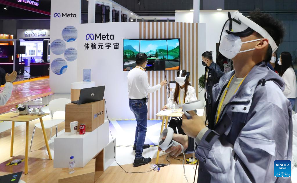Staff members debug VR device at an exhibition booth for the upcoming fifth China International Import Expo (CIIE) in east China's Shanghai, Nov. 2, 2022. Preparations for the CIIE, which will be held in Shanghai from Nov. 5 to 10, have entered the final stage. (Xinhua/Fang Zhe)