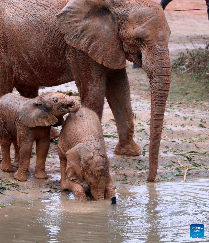 Three African elephant calves eat at the Chimelong National Ex-situ Conservation Base of World Endangered Wild Plants and Animals in Qingyuan, south China's Guangdong Province, Nov. 3, 2022. Five African elephant calves had been born at the base from May to October this year. All of them are now in good health. (Xinhua/Huang Guobao)