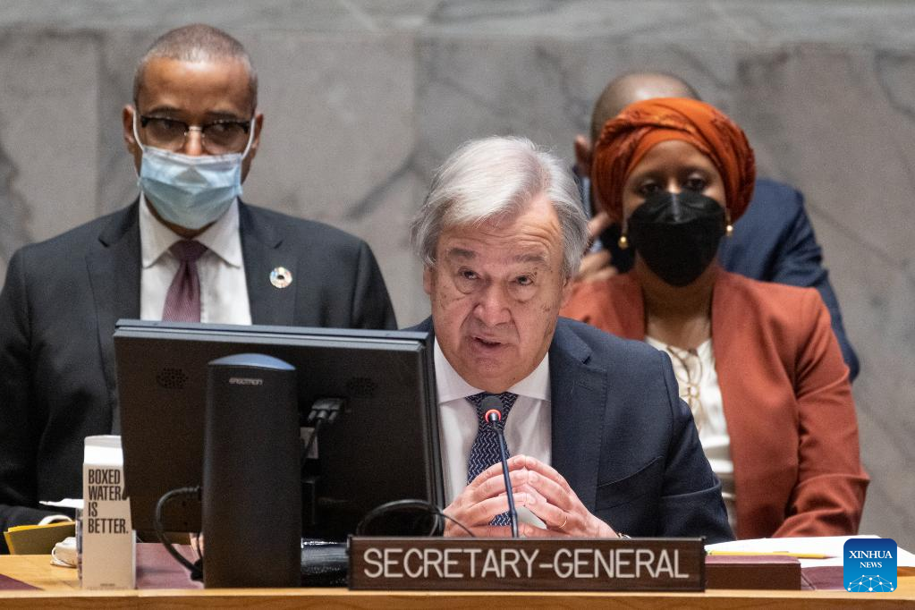 UN Secretary-General Antonio Guterres (Front) speaks at a Security Council open debate on integrating effective resilience-building in peace operations for sustainable peace at the UN headquarters in New York, on Nov. 3, 2022. Guterres on Thursday called for a holistic approach to building resilience in peace operations. (Eskinder Debebe/UN Photo/Handout via Xinhua)
