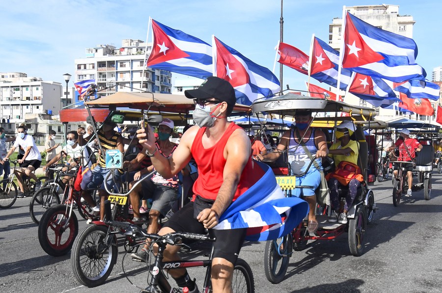 Hundreds of young people participate in a rally against U.S. embargo in Havana, Cuba, Aug. 5, 2021. (Photo by Joaquin Hernandez/Xinhua)