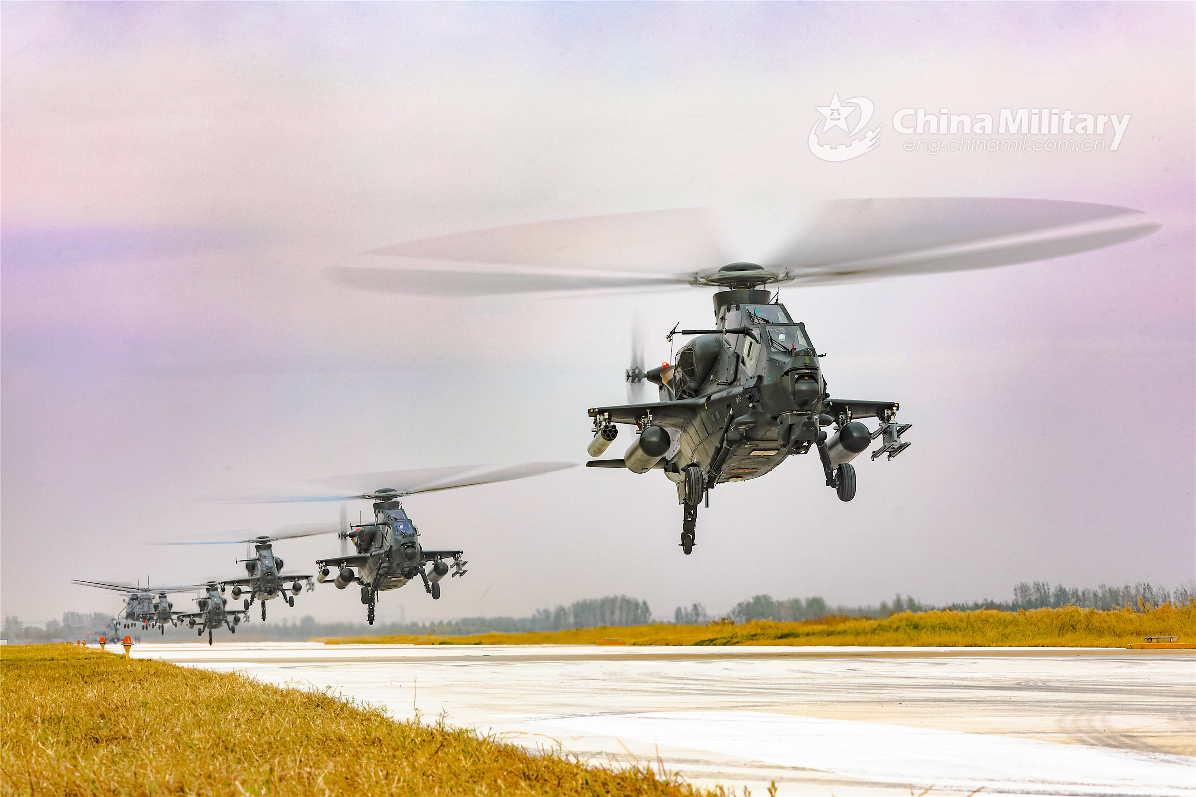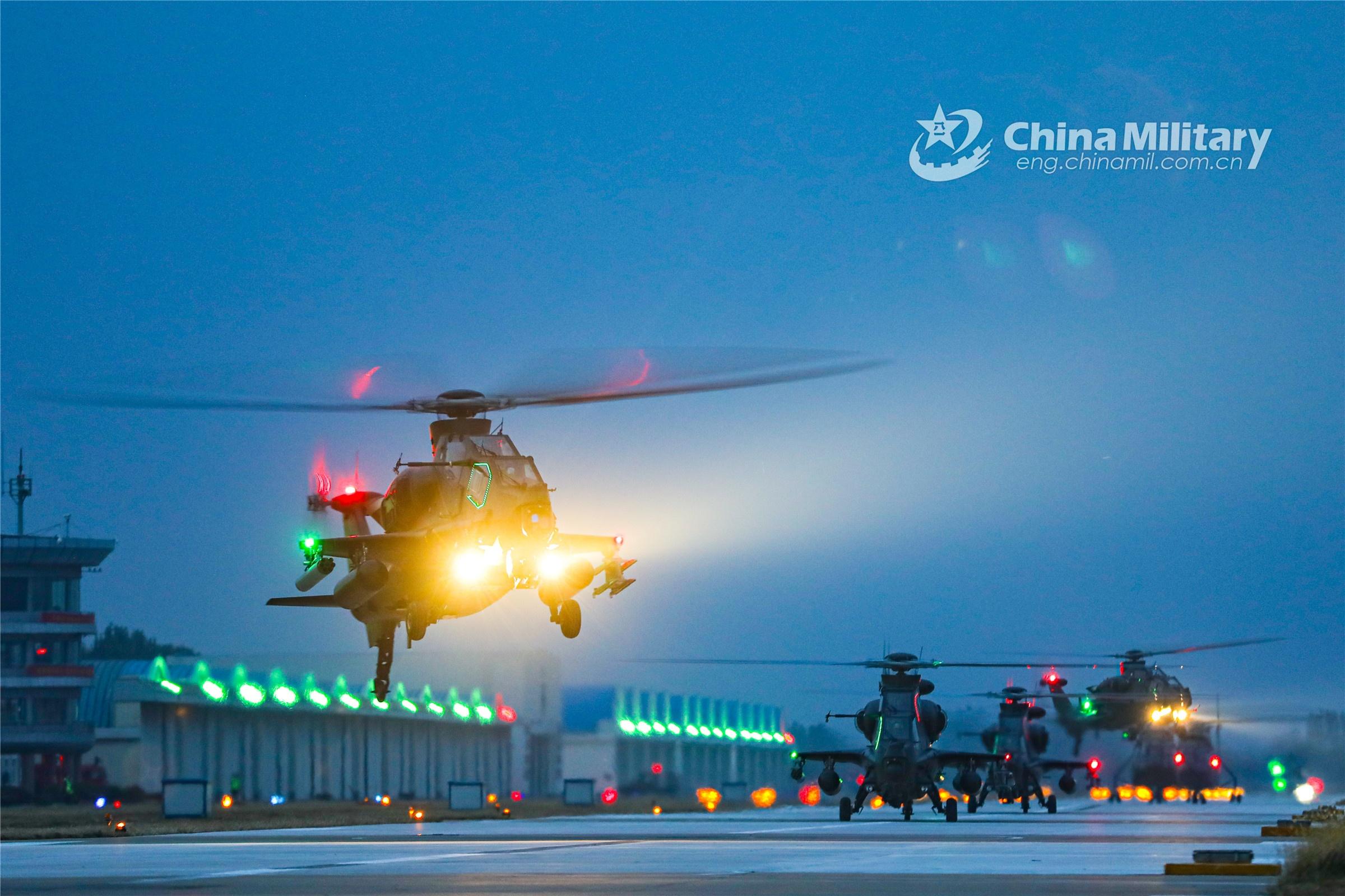 Attack helicopters attached to an army aviation brigade under the PLA 80th Group Army take off from the runway successively during a round-the-clock flight training exercise on October 25, 2022. (eng.chinamil.com.cn/Photo by Li Peng)