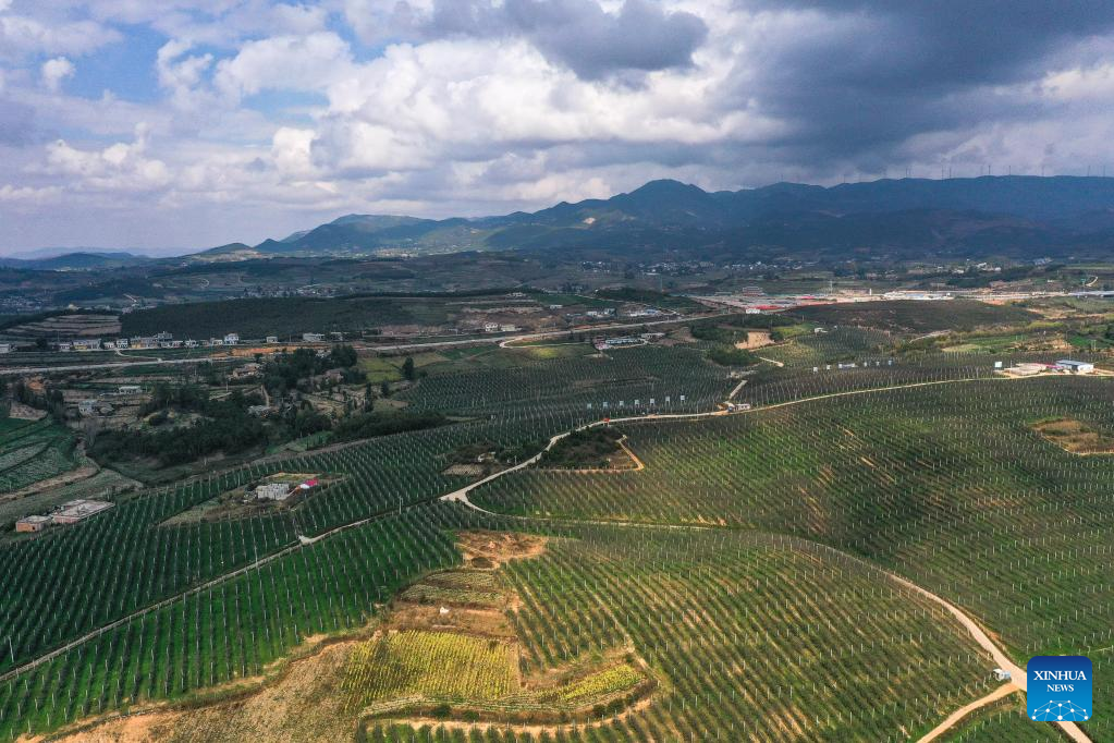 This aerial photo taken on Nov. 3, 2022 shows an apple orchard in Weining Yi, Hui and Miao Autonomous County of southwest China's Guizhou Province. Weining County, with its natural advantages of high sea-level, low-latitude, long sun-exposure time and large temperature difference in day and night, has developed apple planting that brought wealth to local people. (Xinhua/Yang Wenbin)