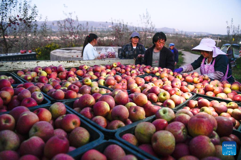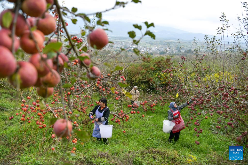 Farmers pick apples at an orchard in Niupeng Township of Weining Yi, Hui and Miao Autonomous County, southwest China's Guizhou Province, Nov. 3, 2022. Weining County, with its natural advantages of high sea-level, low-latitude, long sun-exposure time and large temperature difference in day and night, has developed apple planting that brought wealth to local people. (Xinhua/Yang Wenbin)