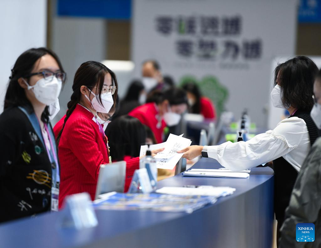 This photo taken on Nov. 4, 2022 shows the information counter at the media center of the 5th China International Import Expo (CIIE) at the National Exhibition and Convention Center (Shanghai) in Shanghai, east China.