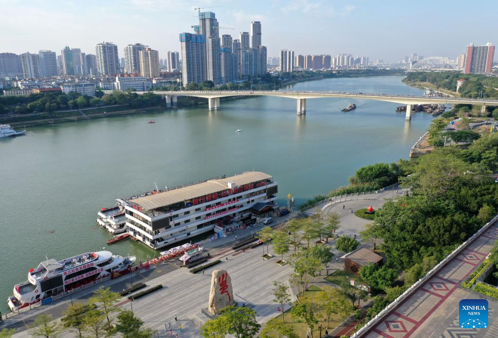 This aerial photo taken on Nov. 4, 2022 shows a cityscape on the banks of the Yongjiang River in Nanning, south China's Guangxi Zhuang Autonomous Region. (Xinhua/Lu Boan)