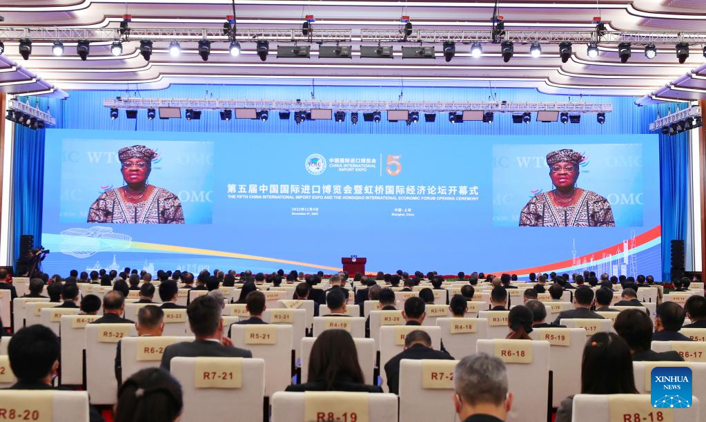 World Trade Organization Director-General Ngozi Okonjo-Iweala speaks via video at the opening ceremony of the fifth China International Import Expo held at the National Exhibition and Convention Center (Shanghai) in east China's Shanghai on Nov. 4, 2022. (Xinhua/Fang Zhe)